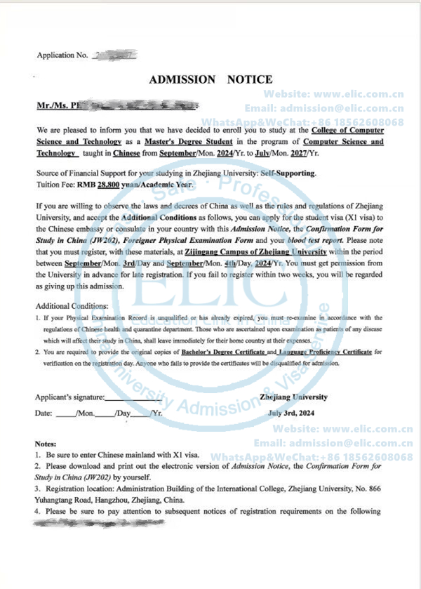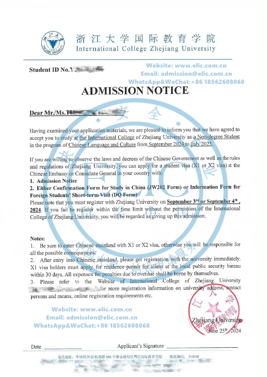 ELIC 2 Student ADMISSION Notices from Zhejiang University